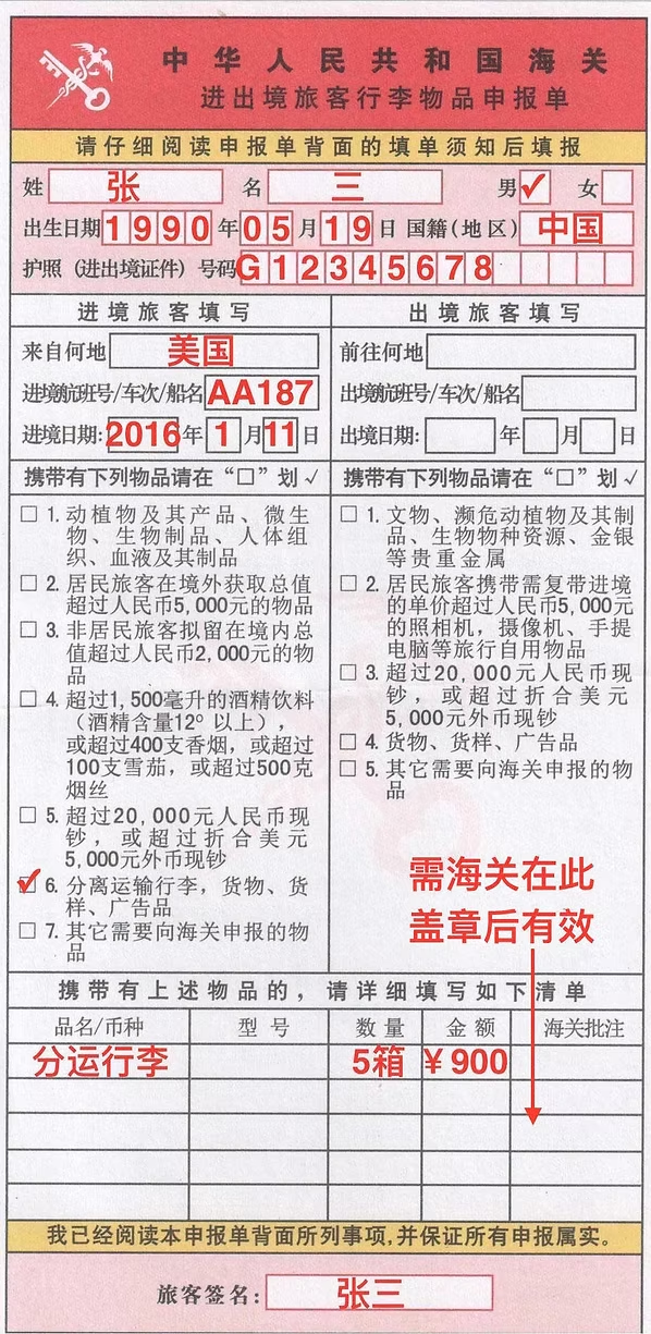 入境申报:指导客户在上海机场走红色通道,获取海关盖章的《申报单》。