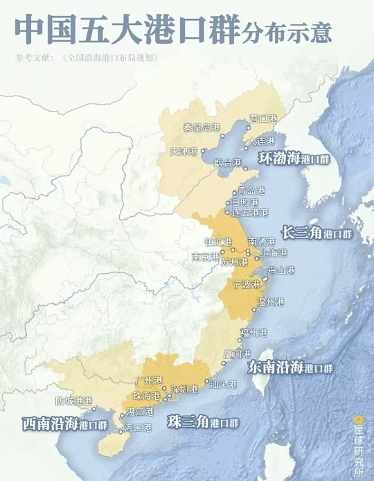 | 宁波舟山港 | 浙江省东部沿海 | 货物吞吐量全球第一,由宁波港和舟山港合并而成,是重要的综合性枢纽港 |